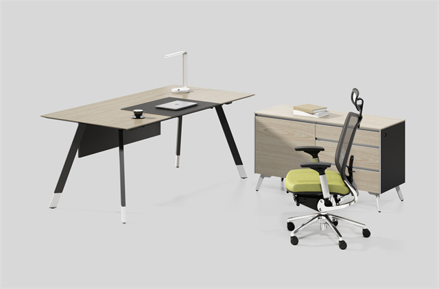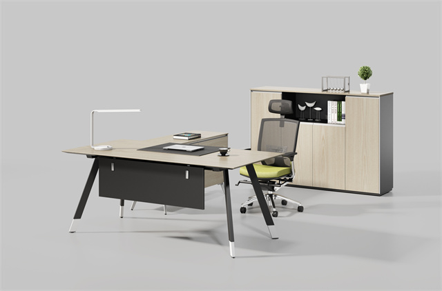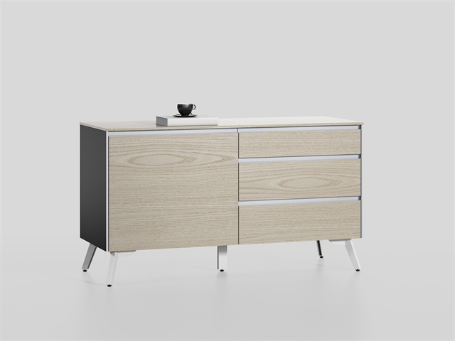 外观造型精致简洁,并且可以一桌两用,平时可以办公,副柜拉开。可以作为一个小型会议桌使用。台面面板斜切处理,斜切部分黑色油漆,更显轻薄时尚。
