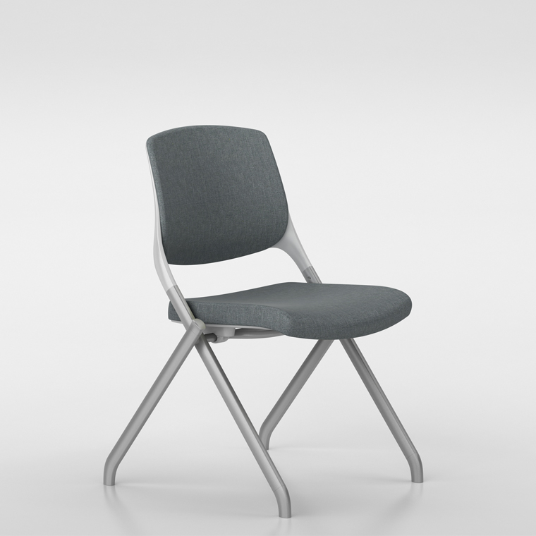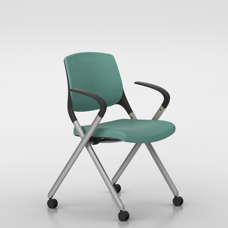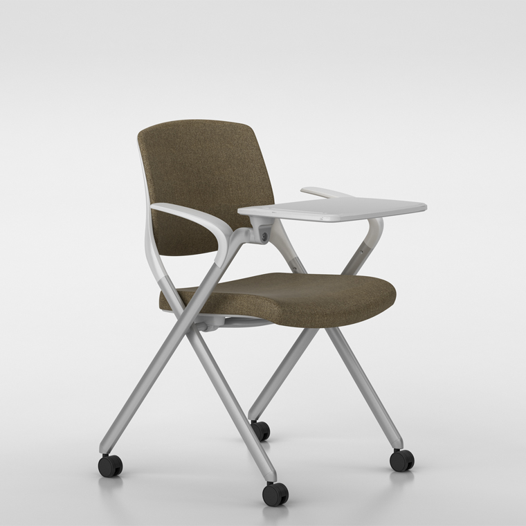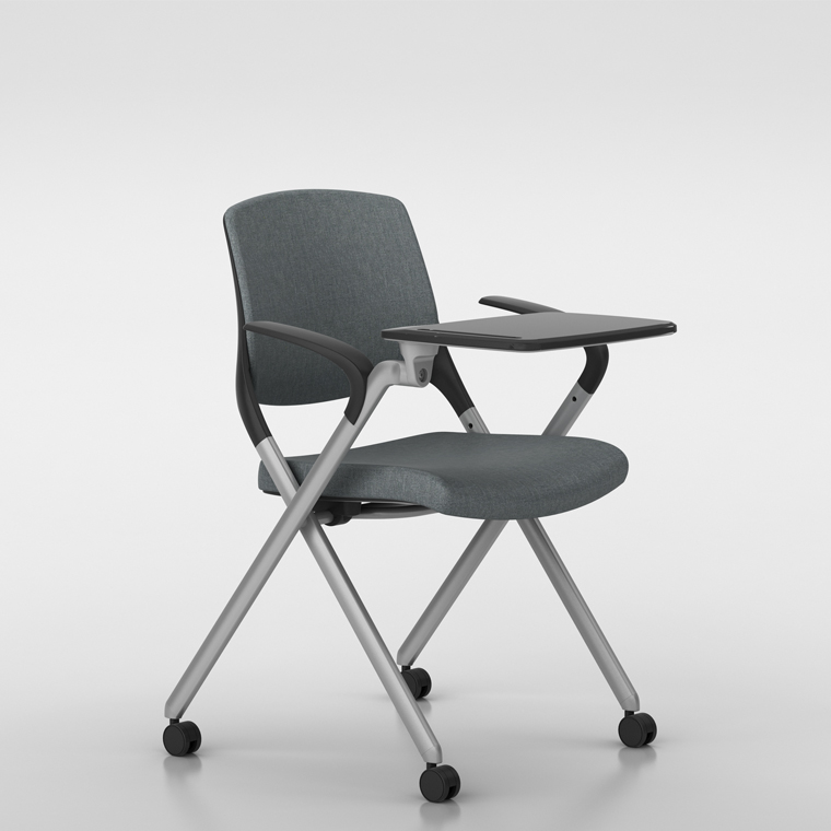 黑色背框,喷塑钢架,固定扶手,带写字板,PA椅轮,活动座垫,可推叠