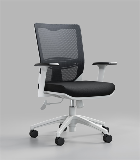 白色背框,细纹网布,弹力座布。固定扶手,PU软面,白色脚。