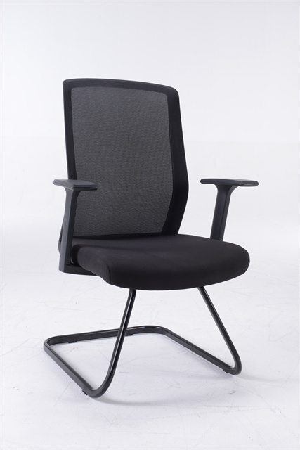 黑色背框,后背尼龙丝网布,T型固定扶手,黑色弓架。椅背有黑色和绿色可选。