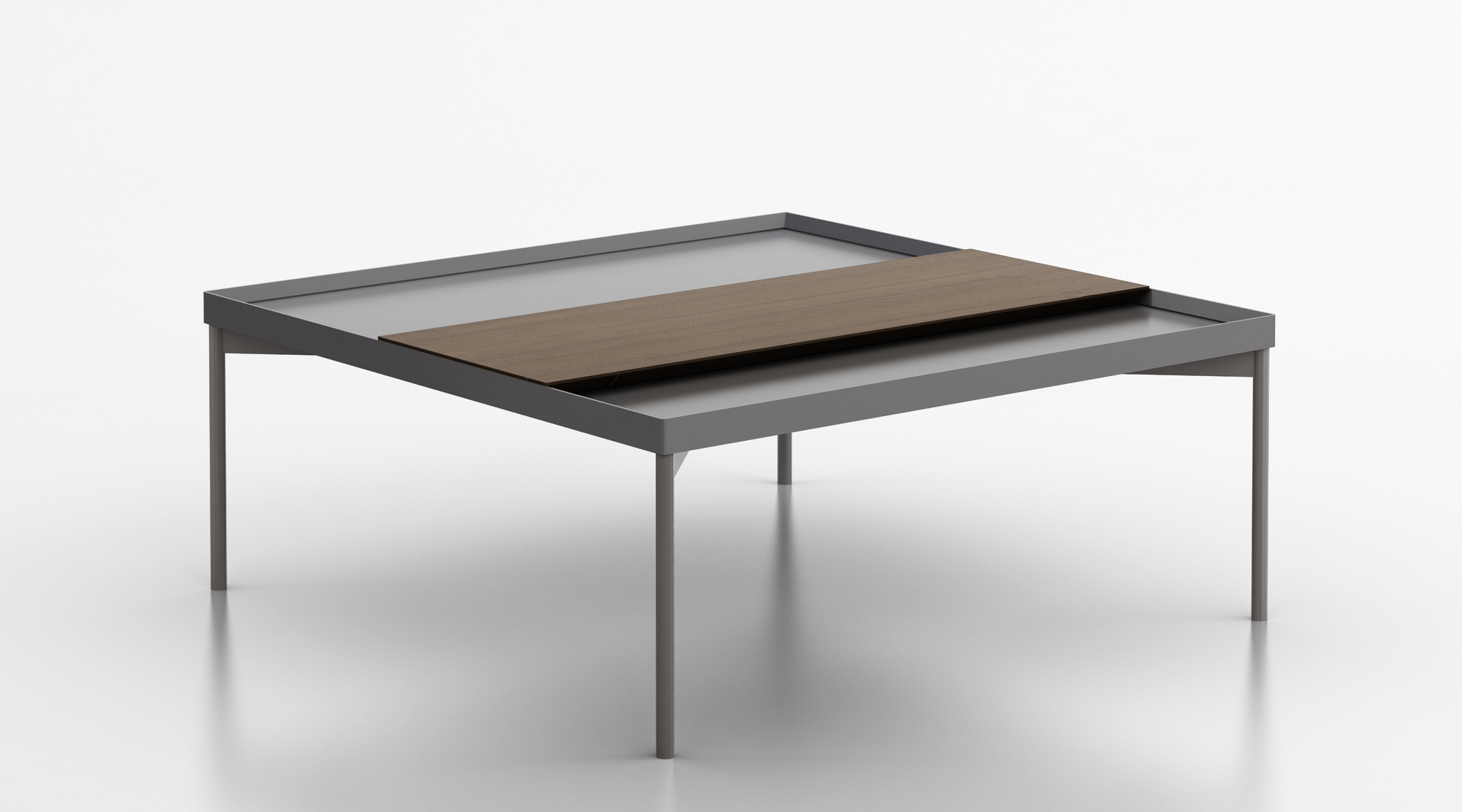 方茶几C015 840*840*340 1.核桃木饰面活动面板,增添灵动性。 2.搭配流星灰托盘设计,外加斜切工艺,美观时尚。